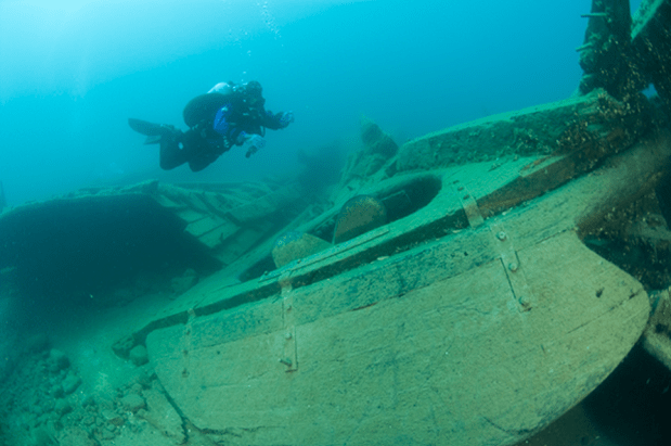 This is an excellent shallow water dive with several key points to investigate. The port and starboard sides have collapsed and now lie along side the bottom of the hull. At the north end of the wreck, there is a huge oak rudder with a 15′ blade, and a sheared off propeller with a 25′ long drive shaft. Moving forward to the bow area, you can find a large length of anchor chain, hawse pipes and an impressive anchor. The most notable feature is the ships boiler, which rises 15′ off the lake bottom. Take some time to examine the construction of ships of this time. You can see excellent examples of scarph joints and hanging knees. This site is also excellent for snorkelers.
