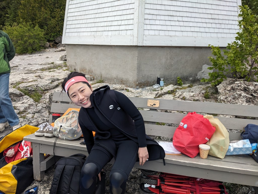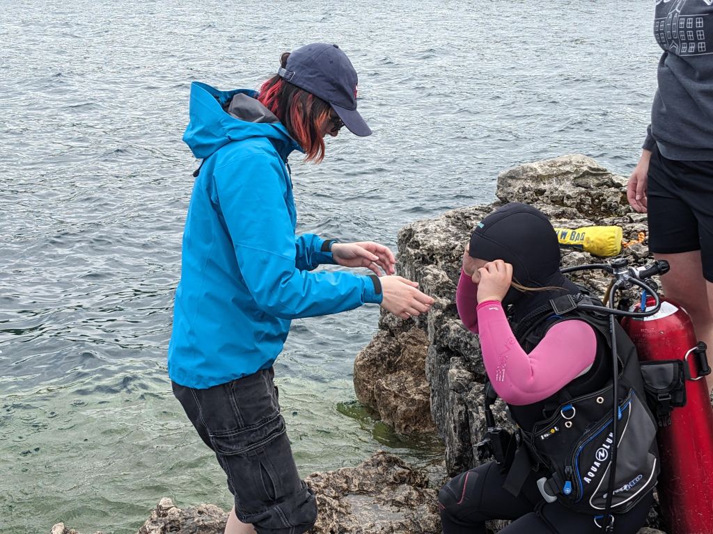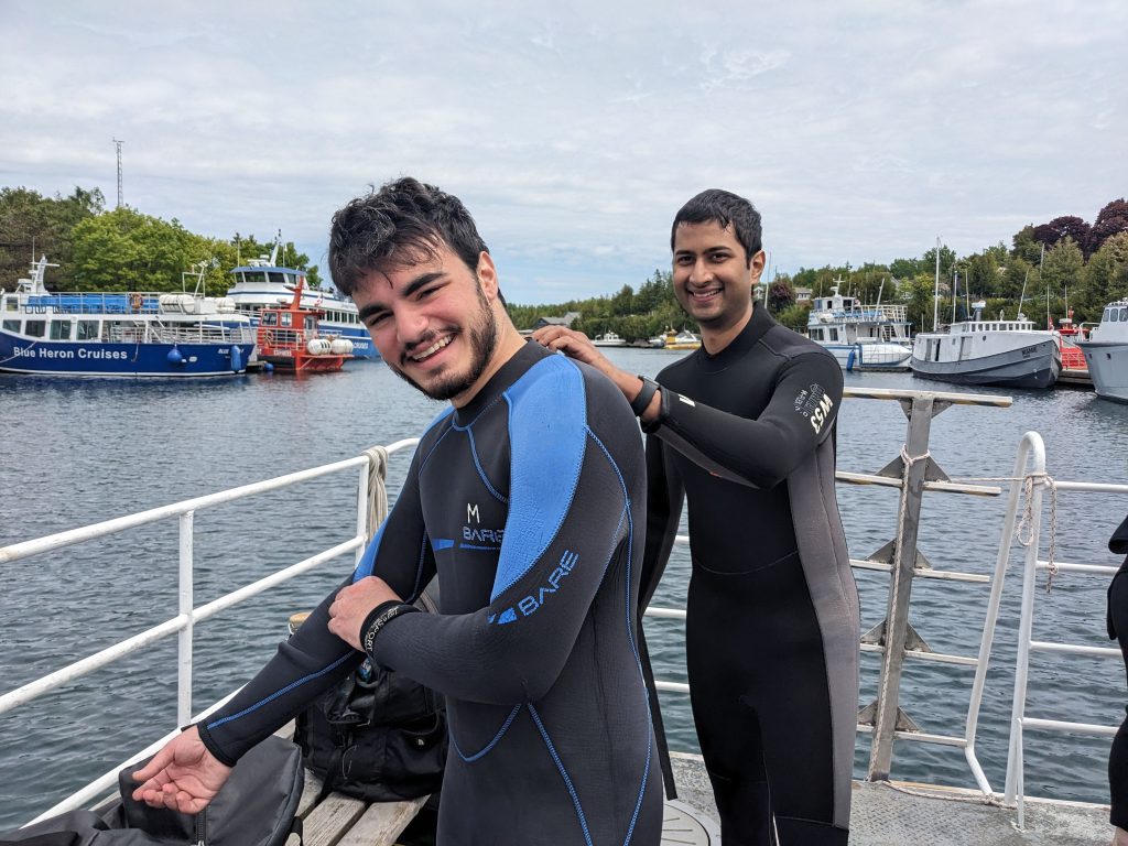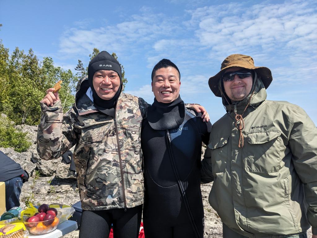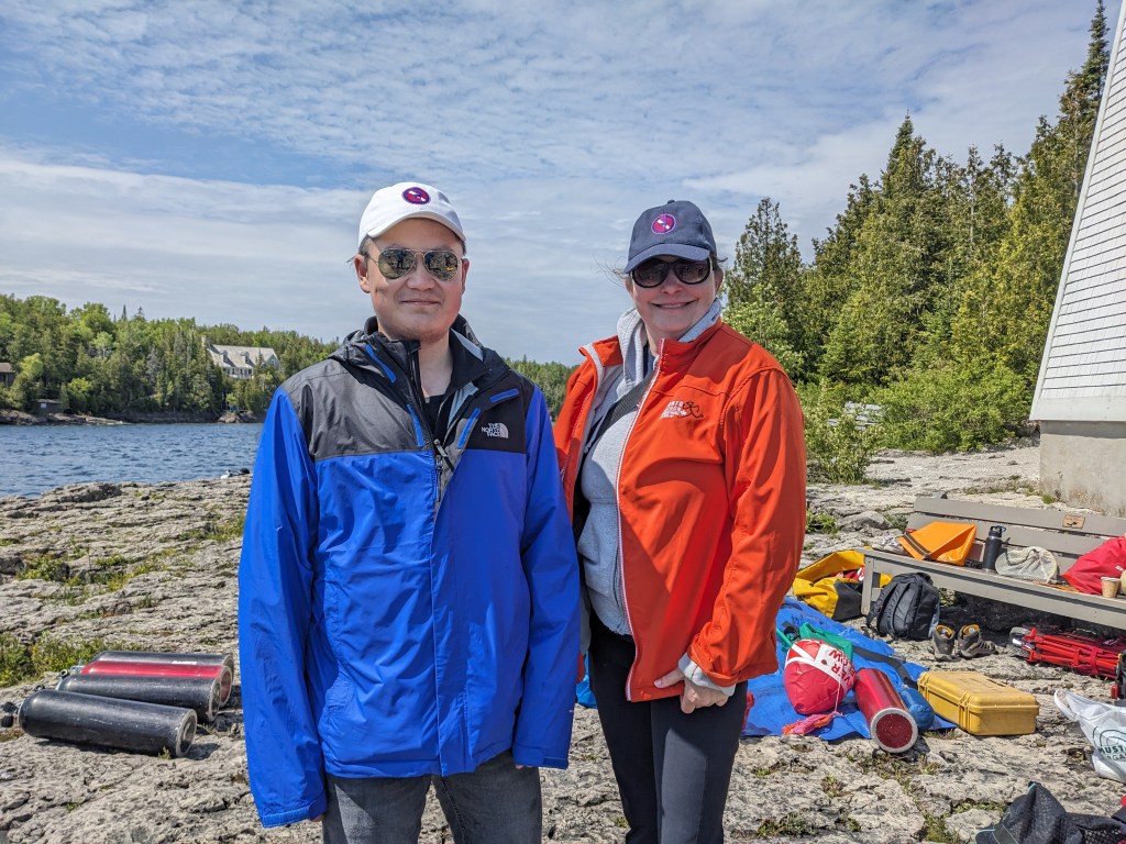 After completing pool training, classroom instruction and written tests, 19 keen divers headed to Tobermory on Friday, June 13, 2025, with their instructional staff of 10 dedicated instructors, divemasters and experienced-diver/on-shore assistants, and a volunteer lunch crew of 4 alumni.