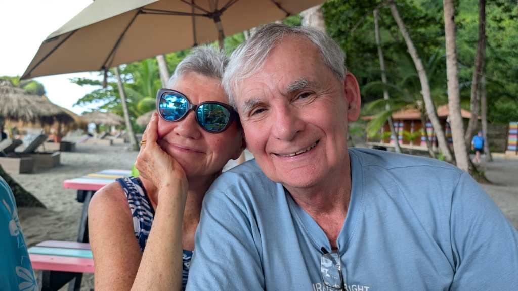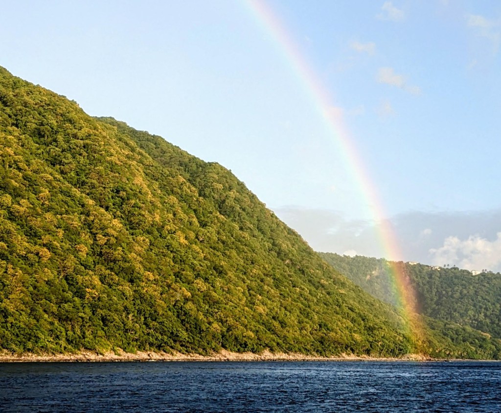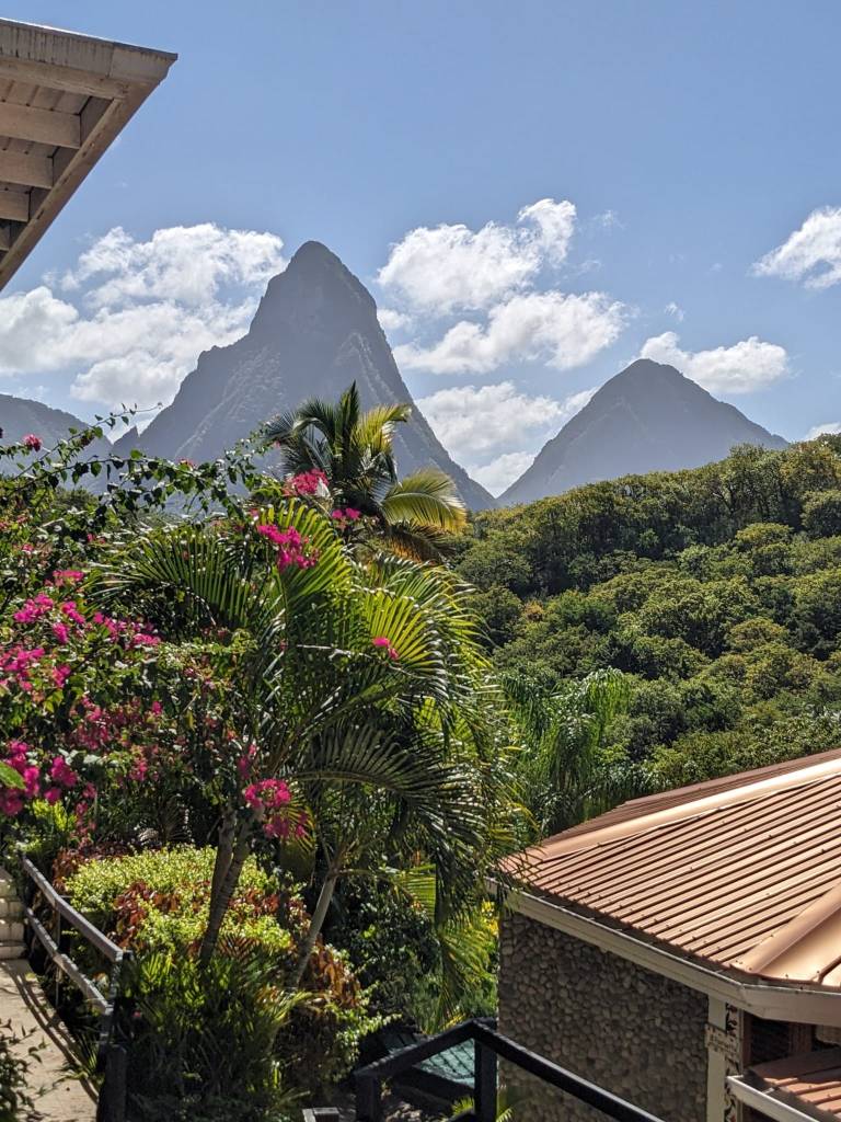 We had rainbows every day! And enjoyed the three restaurants, two bars, beautiful unique rooms, and gorgeous sunrises and sunsets — plus the view of the Pitons. The food was the best ever, always delicious with amazing selections for the breakfast, lunch and dinner specials every day. And oh so many steps to climb!