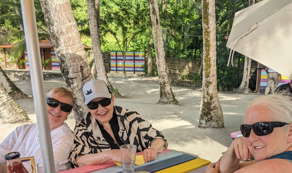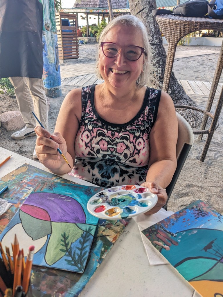 We learned to paint in the intriguing style of the resident artist, Sakey, with bold shapes and colours, outlined in black. His art is displayed in the art gallery at Anse Chastanet. Some of us also gathered with Patti above the Tree House bar to paint to our hearts content in the mornings.