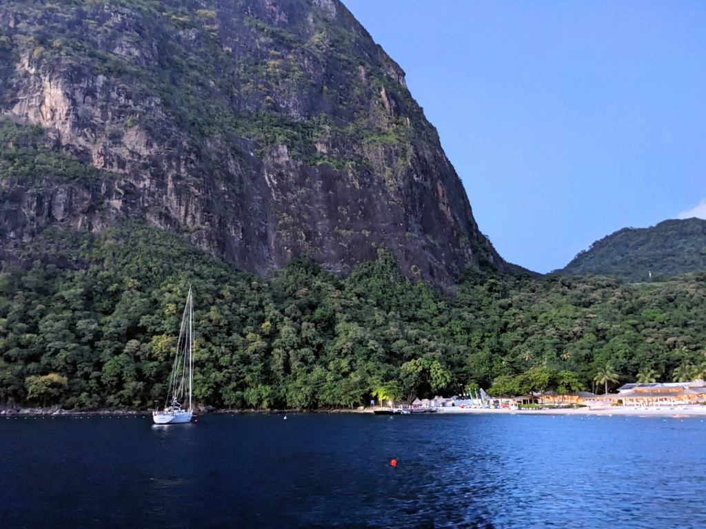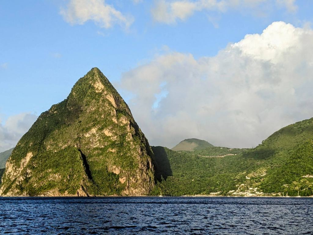 The Pitons rise from the sea on either side of the bay to Sugar Beach. Petit Piton appears taller from the north due to an optical illusion caused by perspective and its steeper, more dramatic profile rising almost vertically from the sea, making it look imposing and larger than Gros Piton, even though Gros Piton is actually higher (2,619 ft vs. Petit Piton at 2,438 ft) and much wider at the base. From other angles, as you move south or away, Gros Piton’s greater height becomes apparent.
