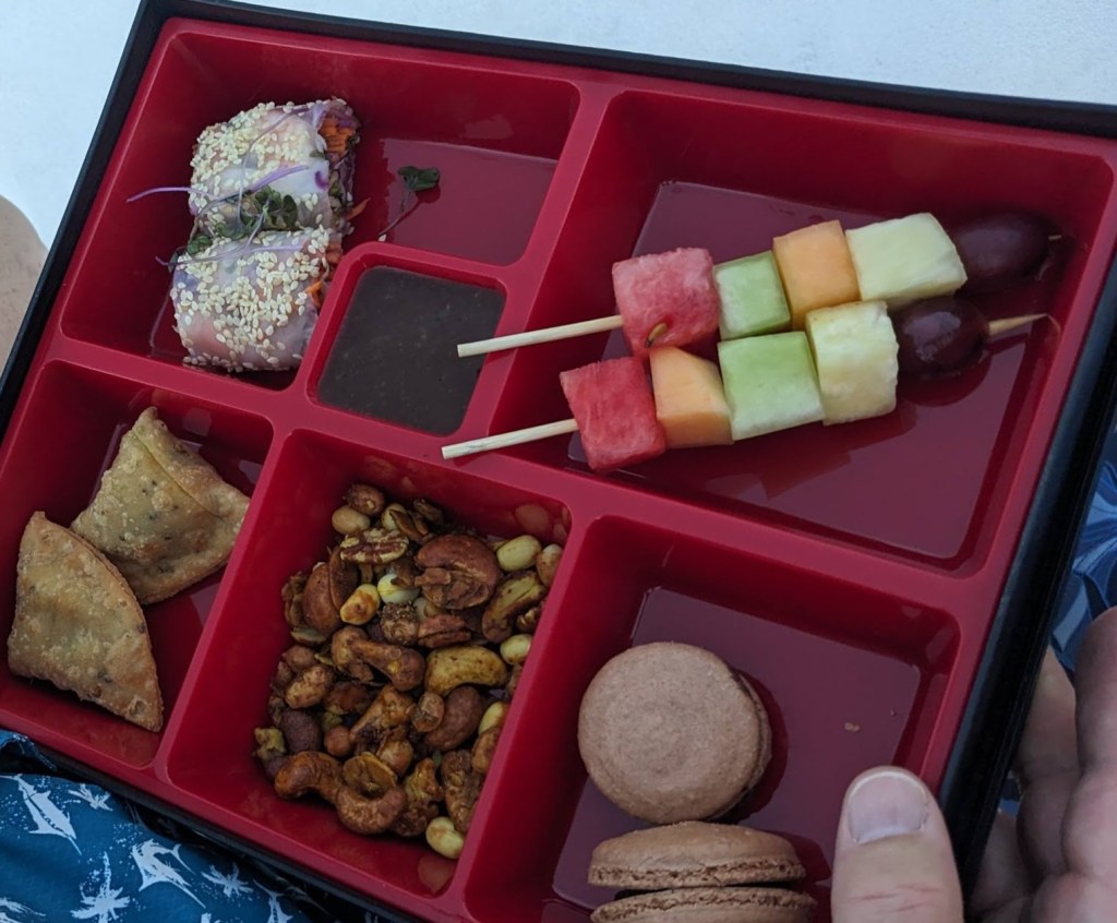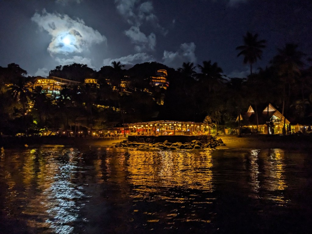 So relaxing, serenaded by the sax player on a gentle cruise with rum punch, open bar, personal bento boxes with yummy snacks, dancing, watching the sunset and cruising back to Anse Chastanet, aglow with lights at night.