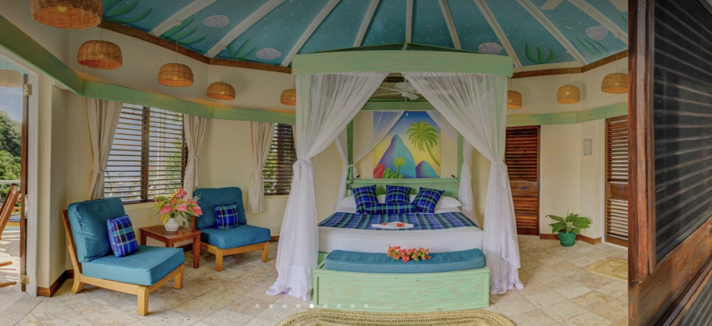 Our resort, Anse Chastanet, is set on a large, private hillside. It’s a 600-acre tropical estate in St. Lucia, featuring lush rainforest, two beaches (Anse Chastanet & Anse Mamin), historic plantation grounds, and stunning views of the Pitons. At beach level, there’s a restaurant, the Piton Bar, an art gallery, spa, shops, yoga pavilion, two unique beaches, a pier, the plantation, mountain bike course on extensive trails, hiking path to the local town of Soufrière, on-site dive shop and dock offering access to marine reserves, house reef and lovely coral reefs of the marine preserve.