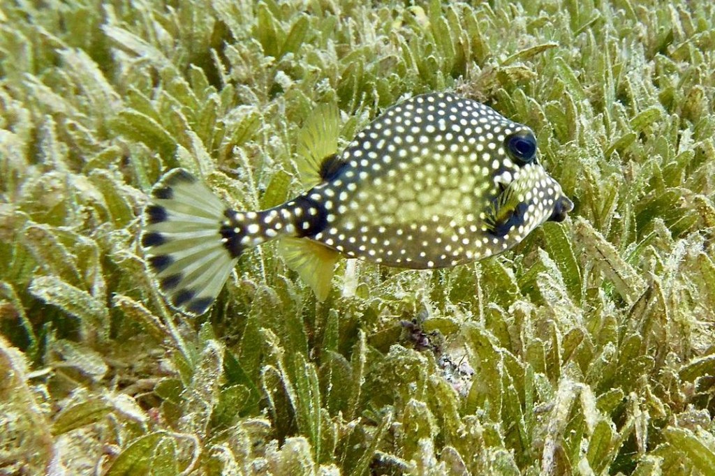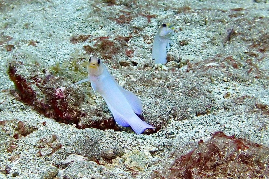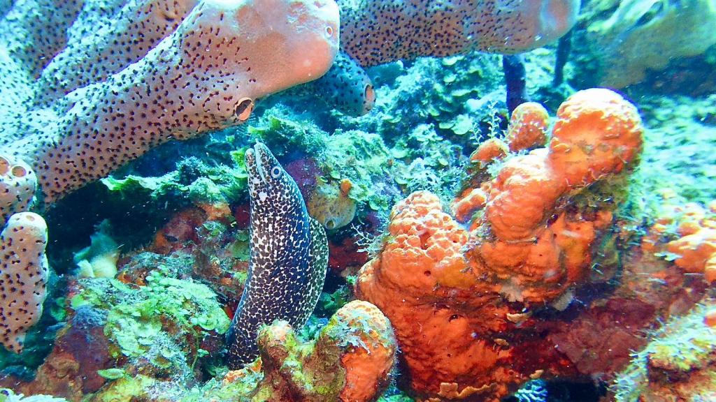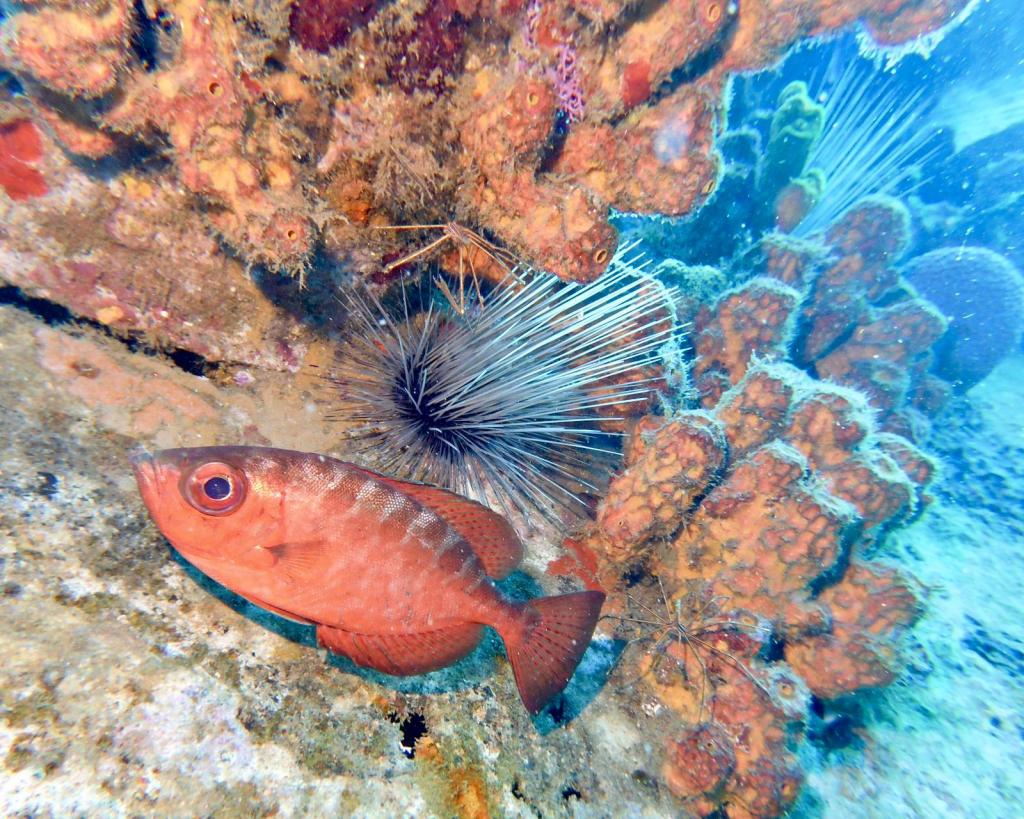 . - Devil’s Hole – Trou Diable or “Devil’s Hole” is a fascinating location. At 40 to 60 feet, there is a steep slope with large barrel sponges and well-developed coral heads, with schools of chromis and grunts in abundance. The shallower section at 20 to 30 feet, offers an intricate maze of channels around large boulders covered in a profusion of coral and sponges. This is a great spot for finding gold spotted eels, spotted drums, stingray, puffers, bobbet worm, the nimble spray crab, cowfish, trunkfish, and a crib full of old conch shells providing an interesting home for small fish.