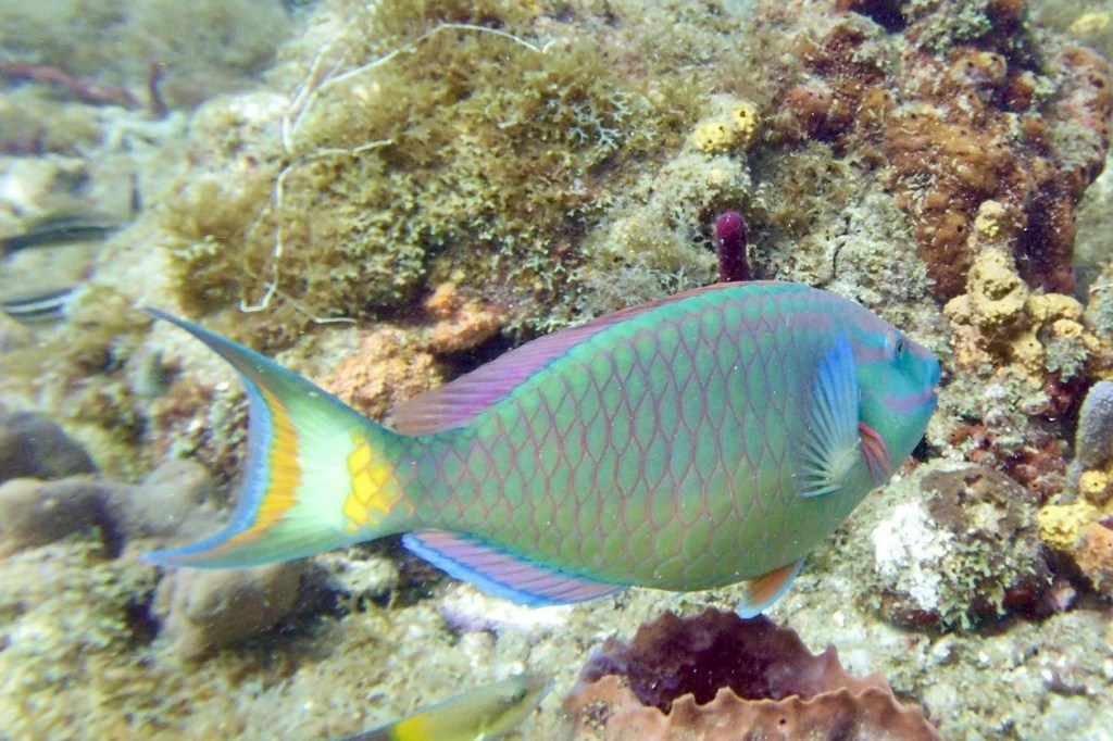 . - Fairyland Reef – Adjacent to Turtle Reef is another beautiful dive site, called Fairyland. This area is on a major headland and is subject at times to very strong currents. This has the benefit of giving the site excellent visibility, and keeping the corals and sponges very clean so that they sparkle with their vibrant colours. The plateau area slopes gently from 40 to 60 feet; the dives are usually 50 feet and shallower on this site. Large boulders offer a number of nooks and crannies in which fish shelter. All over the reef are large numbers of schooling fish, particularly chromis and wrasses. Turtles are occasionally seen on Fairyland.