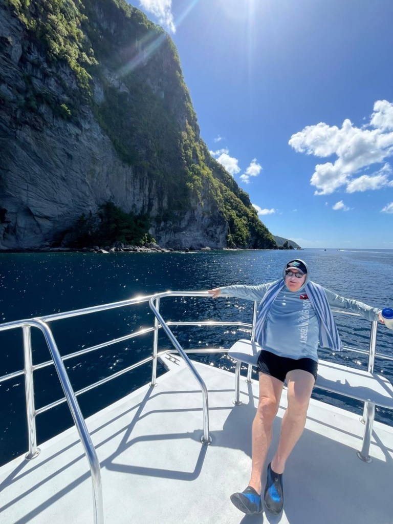 The staff at the Scuba St. Lucia dive operation, including our boat captain, Xavier, and boat assistant Francis, were very attentive to our needs, enacting equipment repairs with speedy, cheerful and knowledgeable skill. Here we are with Omo, standing at the back, thumbs up. This was one of the best dive boats ever: spacious, comfortable, well equipped, shaded from the sun, serving delicious treats at the surface interval.