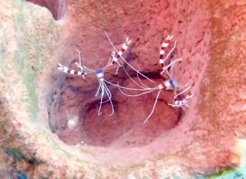 - Piton Wall – At the base of Petit Piton, this dramatic wall falls from the surface to many hundreds of feet below. Sea whips, gorgonians, delicate soft corals and lots of large feather duster worms, make this a colourful location. Barracuda, spotted morays, banded coral shrimp, lobster and crab were spotted. Gazillions of Brown Chromis (the “potato chips of the sea”) were seen on every dive this week — primary food source for larger predators in the coral reef ecosystem.